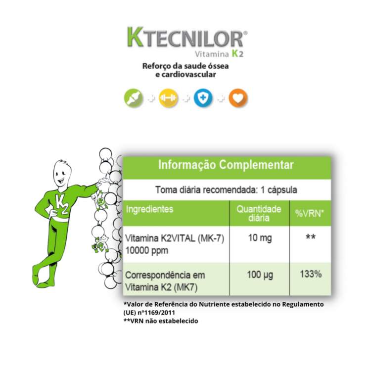 Suplemento alimentar para a proteção da densidade óssea, que contribui para o aumento no processo de formação de osso, diminuição de perda óssea e síntese de colagénio. Ajuda a evitar o depósito de cálcio nas paredes dos vasos sanguíneos e redireciona-o para os ossos. Reduz ainda o risco de diabetes através da sensibilidade à insulina e melhora as capacidades cognitivas. Tomar 1 cápsula por dia. Não aconselhado na gravidez, nem em caso de toma de anticoagulantes.